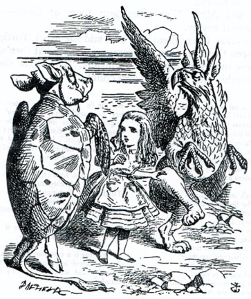 Фальшивая черепаха, Черепаха Квази, Деликатес (Mock Turtle) на самом деле блюдо, которое имитирует вкус дорогостоящего черепашьего супа. Вместо черепахи в него клали телятину. Поэтому на оригинальных иллюстрациях Джона Тенниела черепаха изображена с коровьей головой.