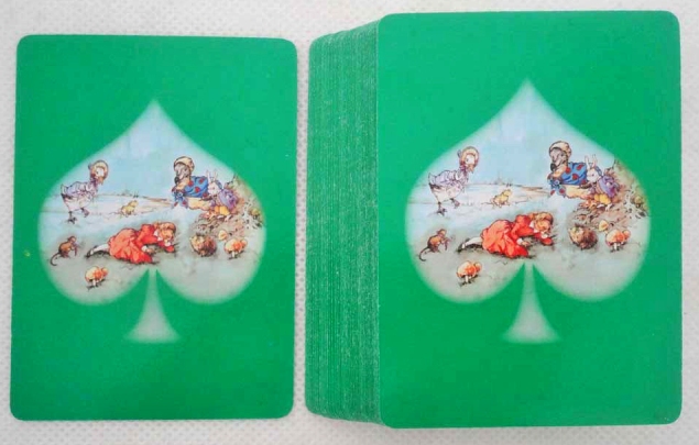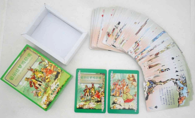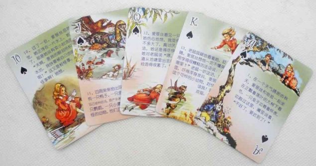 Колода игральных карт для покера «Приключения Алисы в Стране чудес» состоит из 52 карт мастей и 2 джокеров. На каждой карте — красочный рисунок, который сопровождают отрывки из сказки на китайском языке.