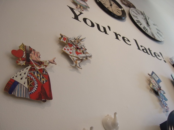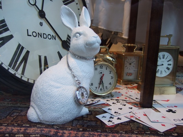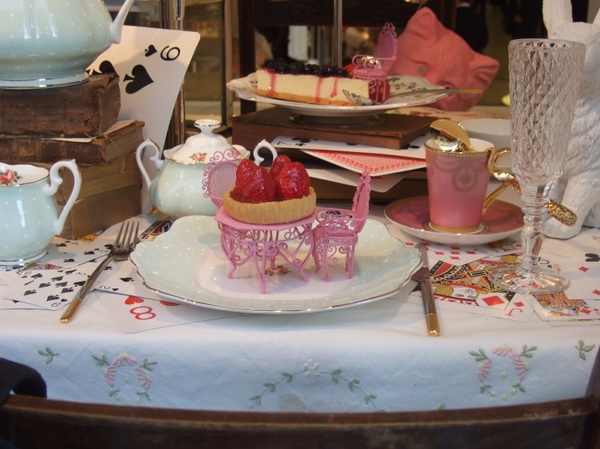 Лондонский магазин превратился в настоящую комнату чудес. Витрину украшали чайные наборы, пирожные, книги, белый кролик, карты, открытки с изображением персонажей книги, пол превратился в ломаную шахматную доску. А на стене красовалась надпись «Ты опаздываешь».