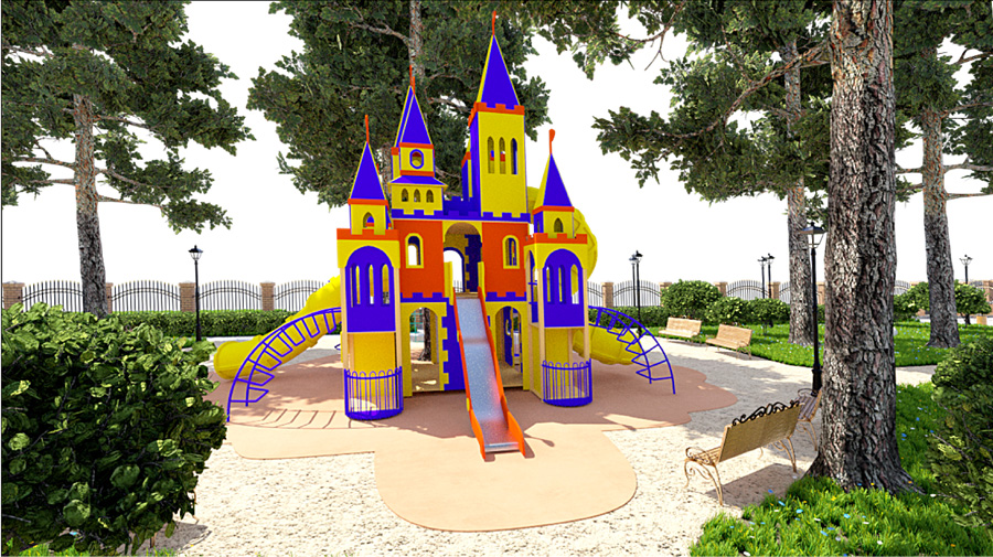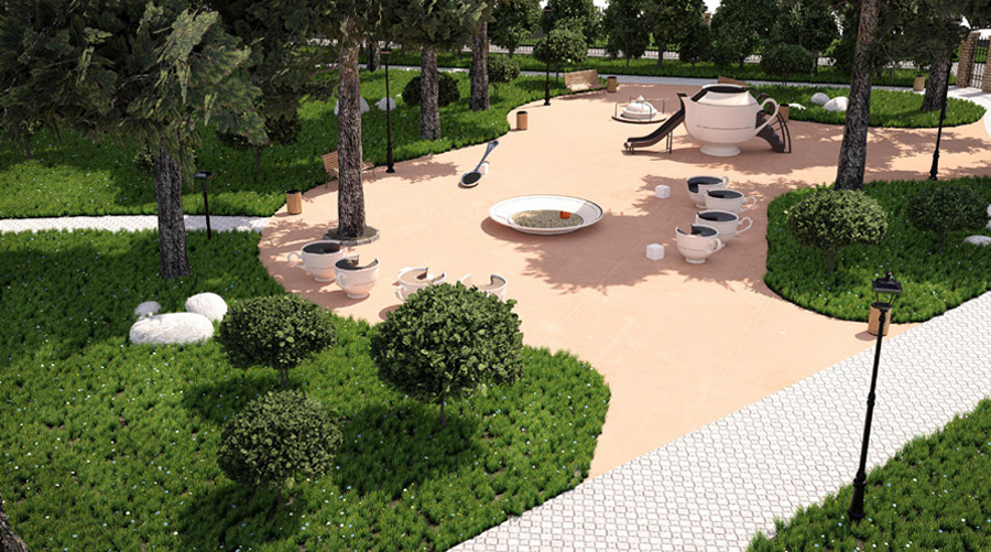 Вторая площадка перенесет малышей во «Дворец Карточной Королевы» — игровой комплекс с горкой, а третья позволит побывать в «Чайном сервизе»: вдоволь порезвиться в песочнице-блюдце, на ложках-качелях и на карусели в виде крышки от чайника. Родители деток в это время могут чинно вести беседы, расположившись в гигантских «чашках» или на «кубиках сахара».
