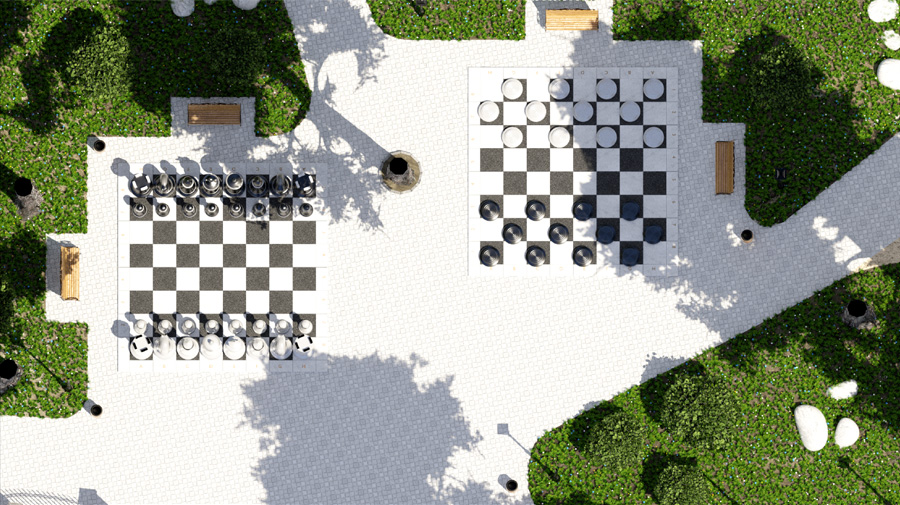В южной части «Страны чудес» расположились несколько площадок — взрослая и две детских. Первая представляет собой два огромных шахматных поля, с расставленными на нем полутораметровыми шахматными фигурами и шашками из пластика, которые можно без труда передвигать. В зимний период вместо партий здесь планируется организовывать конкурсы по созданию ледовых композиций.